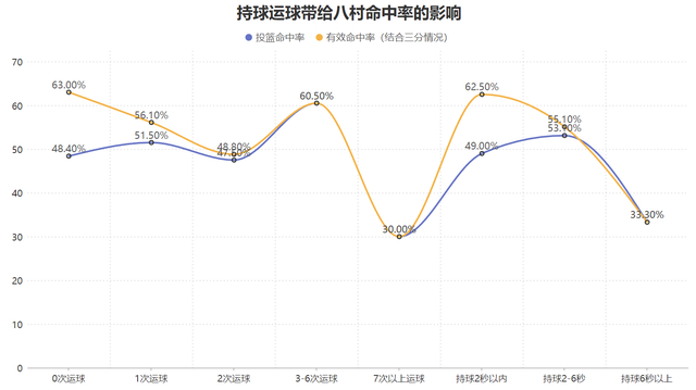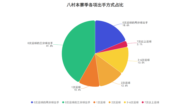 八村的得分方式非常简单,他接球不运球就出手的占比高达60.4%,而其中41.8%接球不运球的出手来自于三分线外,同时还有一定比重1-6次运球出手,因此他本赛季使用频率最高的方式是三分线外接球就投,以及三分线内接球就投或简单运球后的出手终结,而这样做也能令他的投篮命中率以及运动战也就是结合三分情况的有效命中率达到更高: