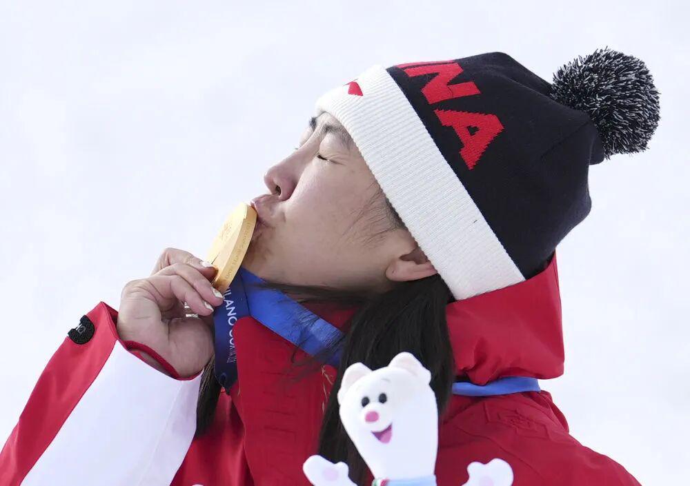 2月18日,中国选手徐梦桃在颁奖仪式上亲吻金牌。新华社记者 胡超 摄