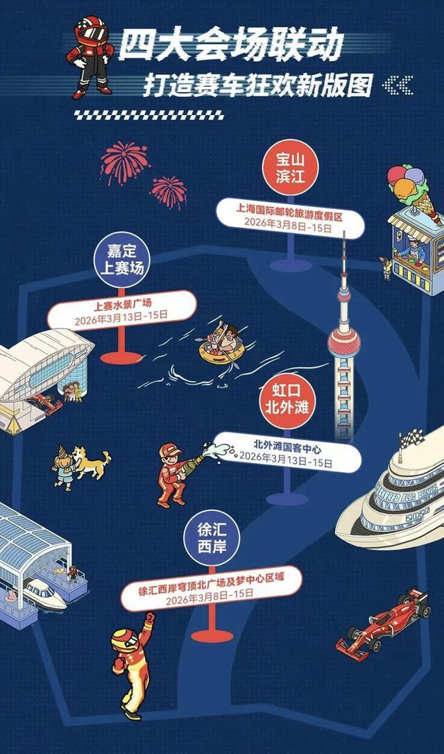 记者了解到,今年嘉年华全面升级,首次采用“多点串联”模式,在徐汇西岸、嘉定上赛场、虹口北外滩、宝山滨江设立四大主题会场,将赛车文化真正融入城市街角。